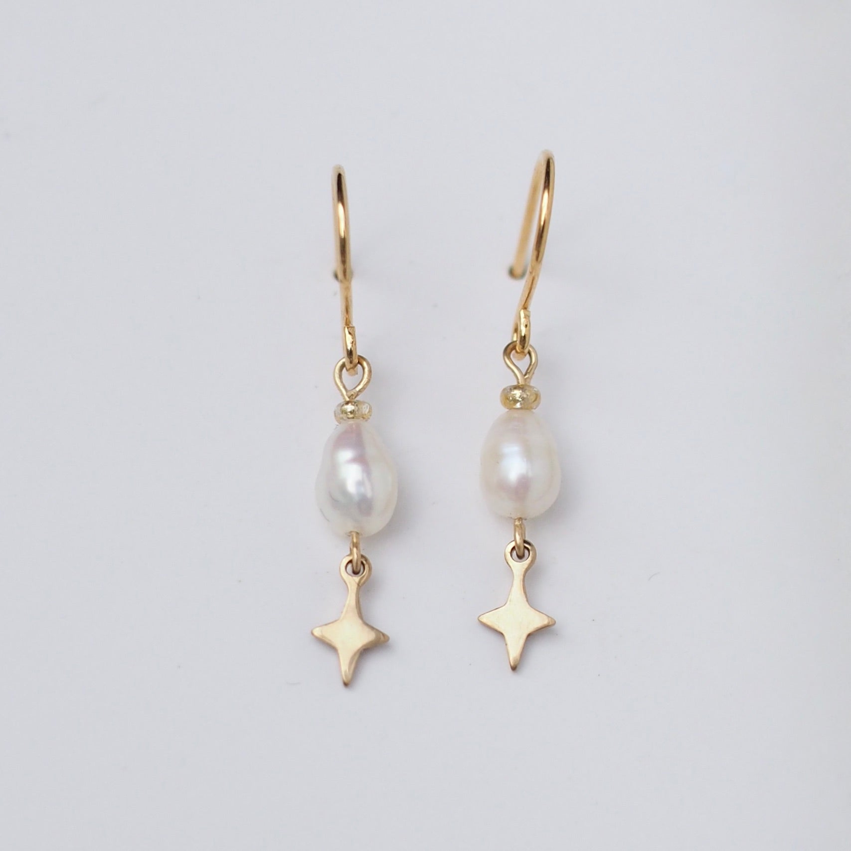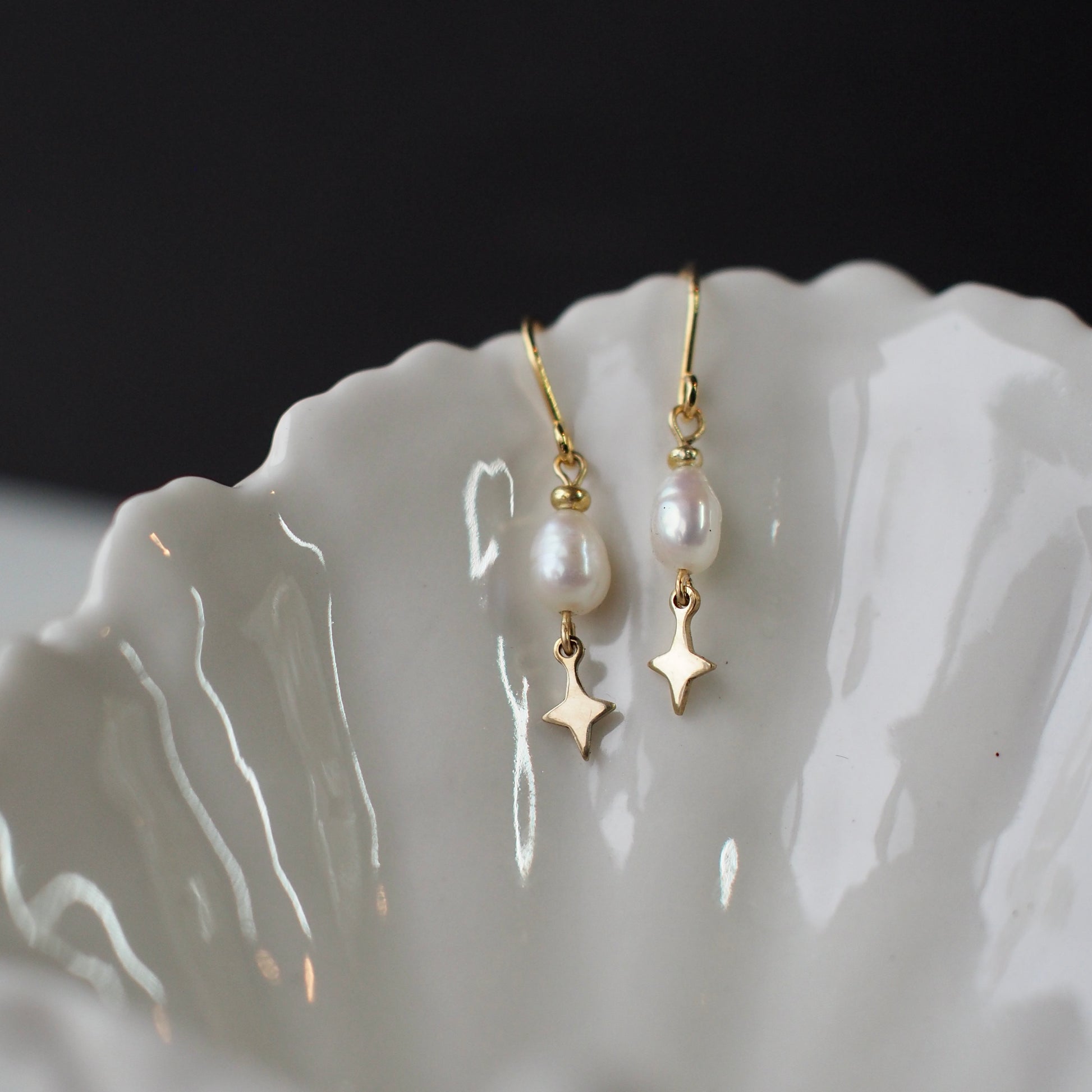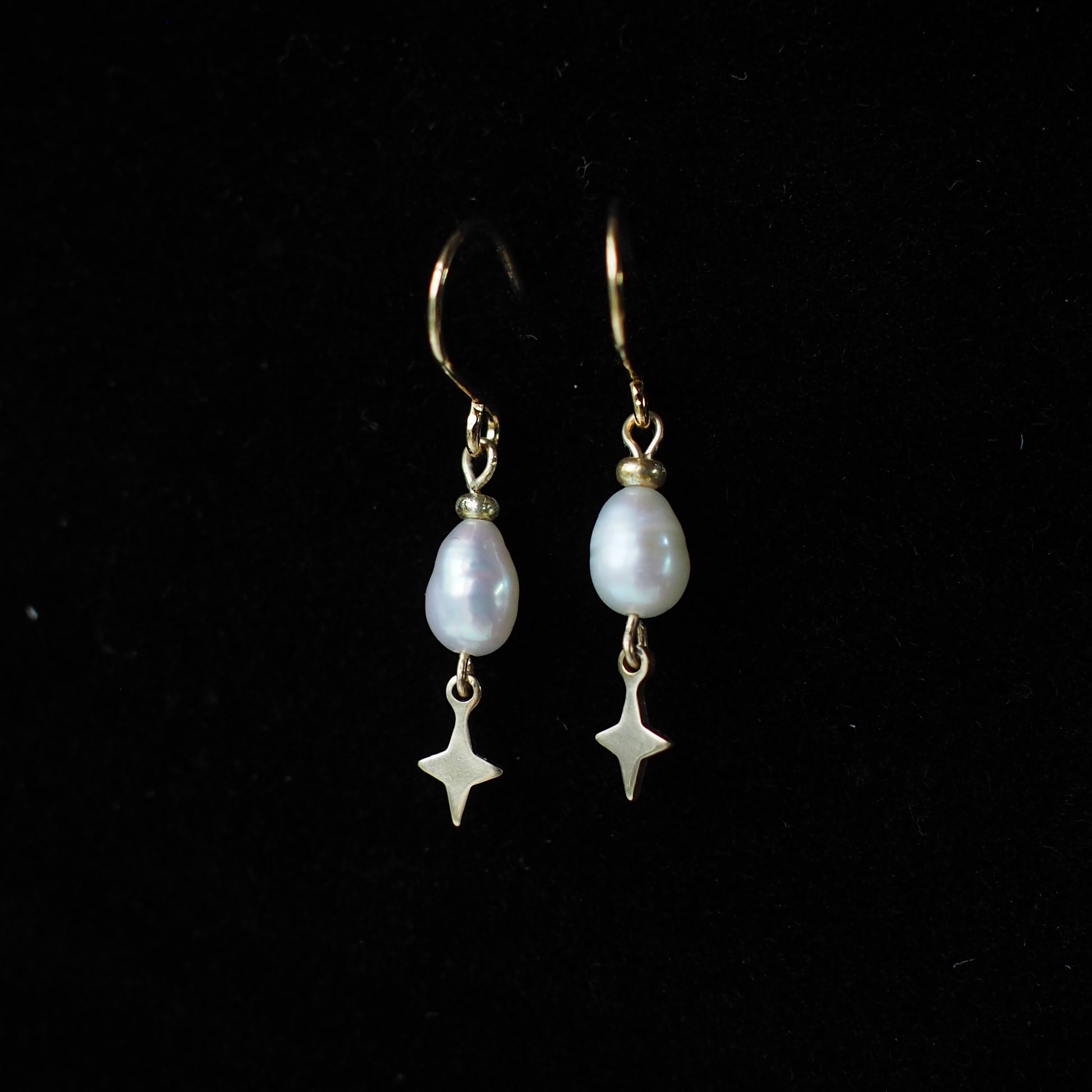 Introducing our enchanting Cosmic Pearl Earrings, a pair of celestial earrings that combine the otherworldly beauty that both outer space and the ocean share. Each earring features a lustrous, irregular, oval-shaped pearl, approximately 7mm in diameter, exuding a pearlescent glow reminiscent of the moon's gentle radiance. Suspended below is a dainty star char, measuring just under a centimeter in length, adding a touch of celestial charm.