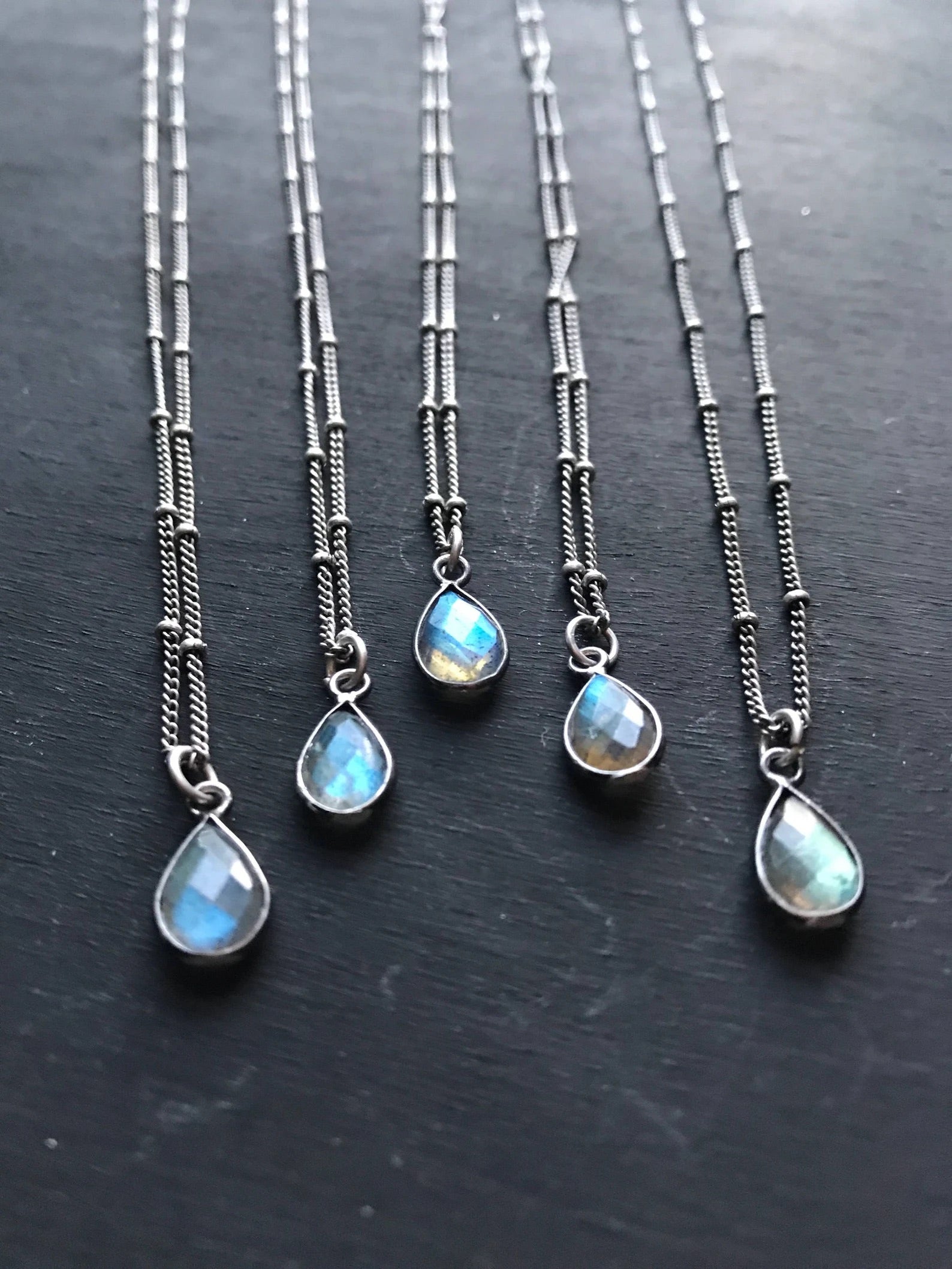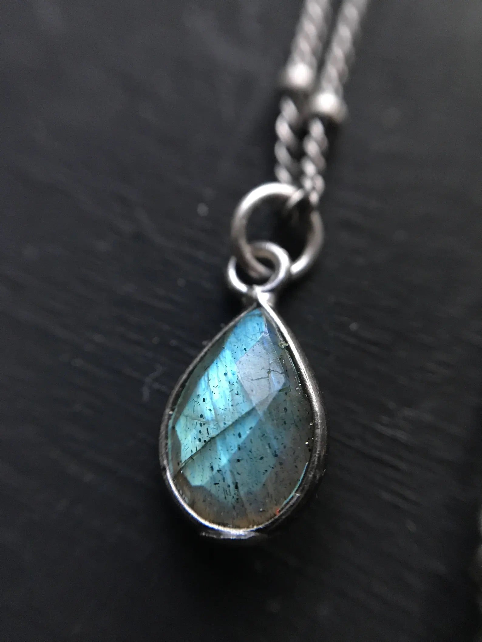 This labradorite choker is made from a flashy, tiny teardrop of labradorite on a dotted dusty silver chain. Labradorite is a beautiful blue green stone known for its flash created by the different layers of minerals. This understated, subtle choker adds just a dash of light and color and looks really beautiful on.