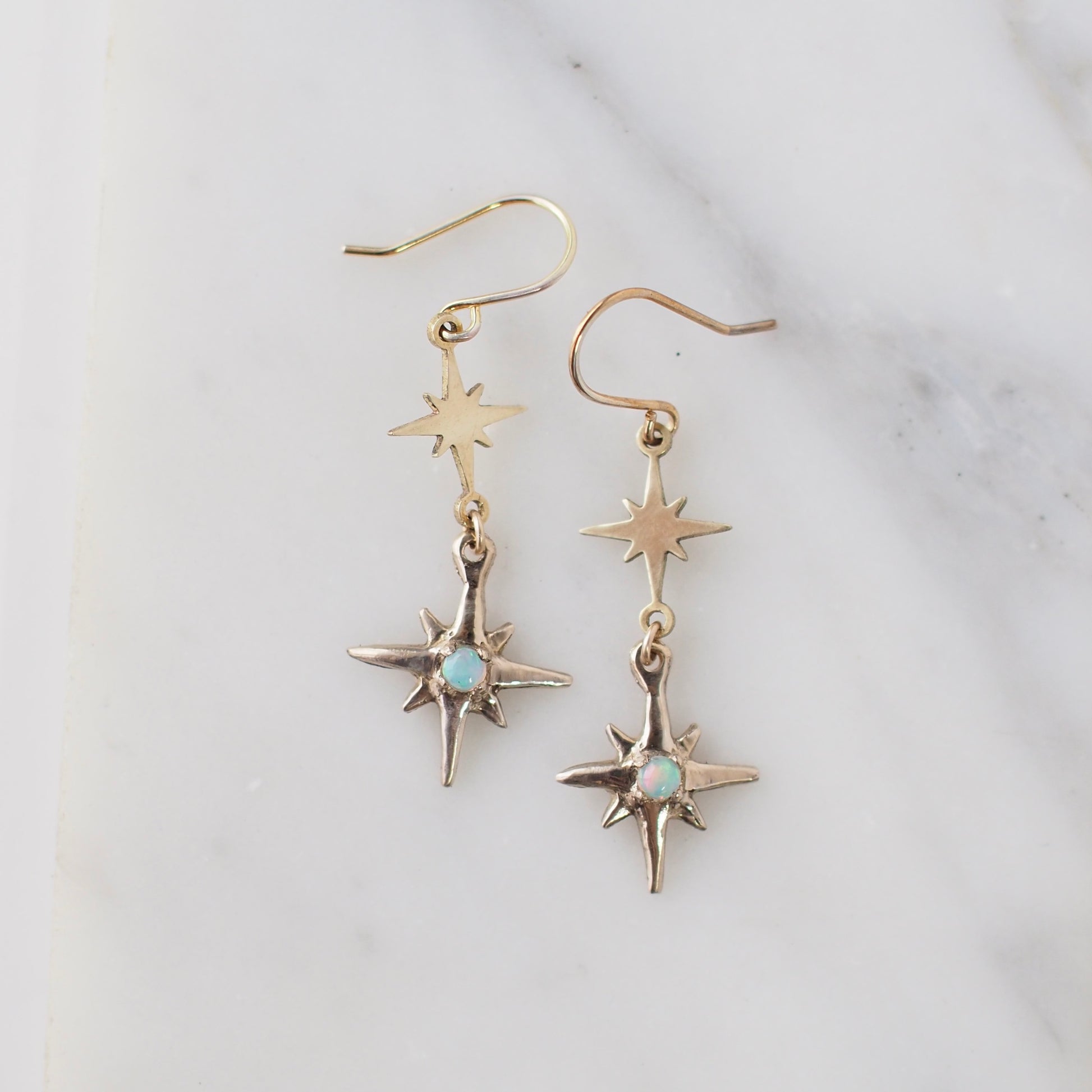 This constellation of bronze stars are 1.5" in length altogether. The larger Polaris shape is cast in gold tone bronze and contains a 3mm gemstone and is connected to the smaller star charm which is a centimeter in length. The smaller star is very thin allowing for earrings that make a bigger visual statement without pulling your ears down.