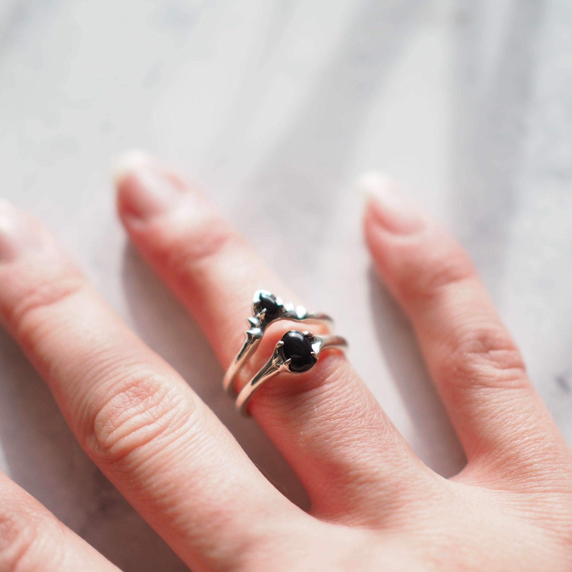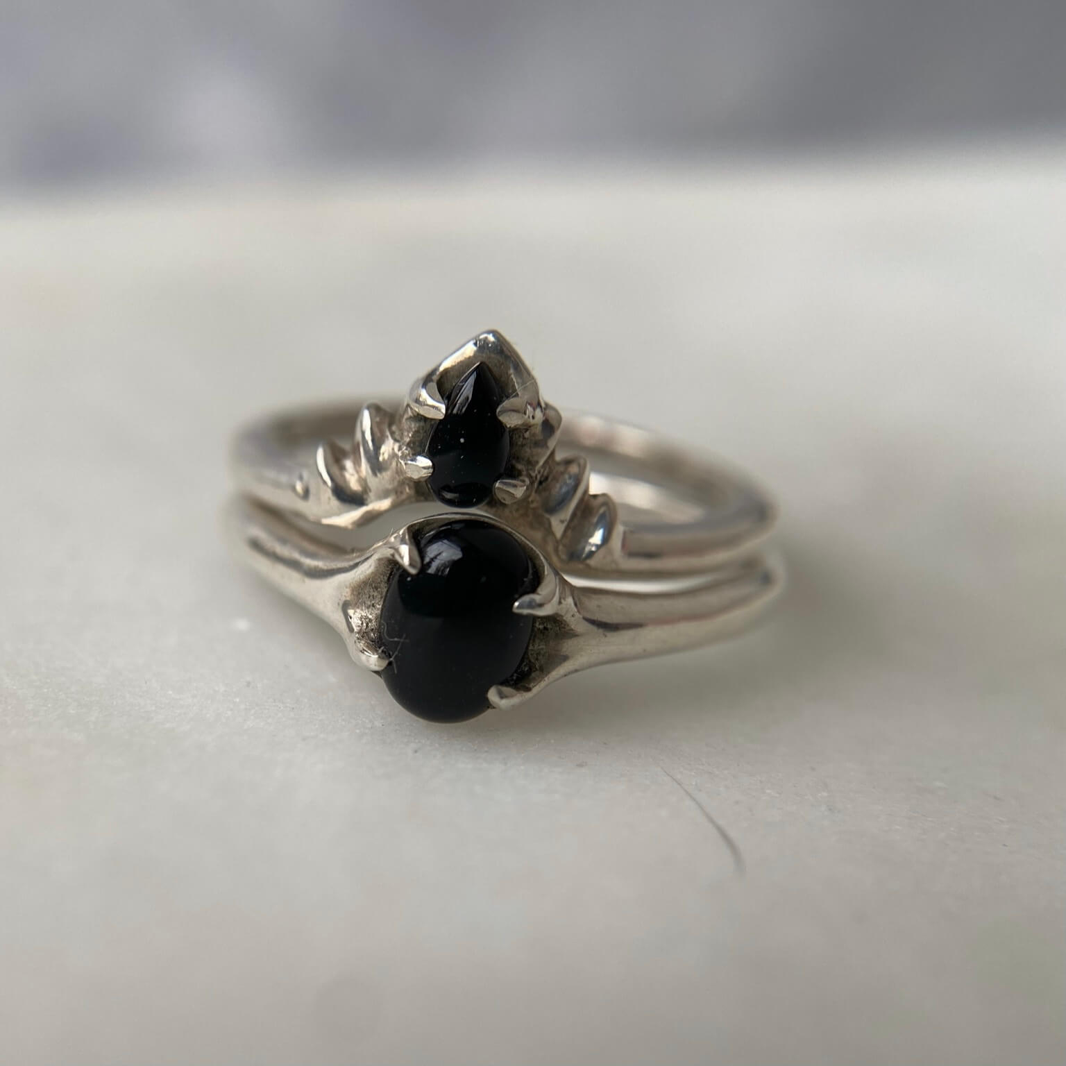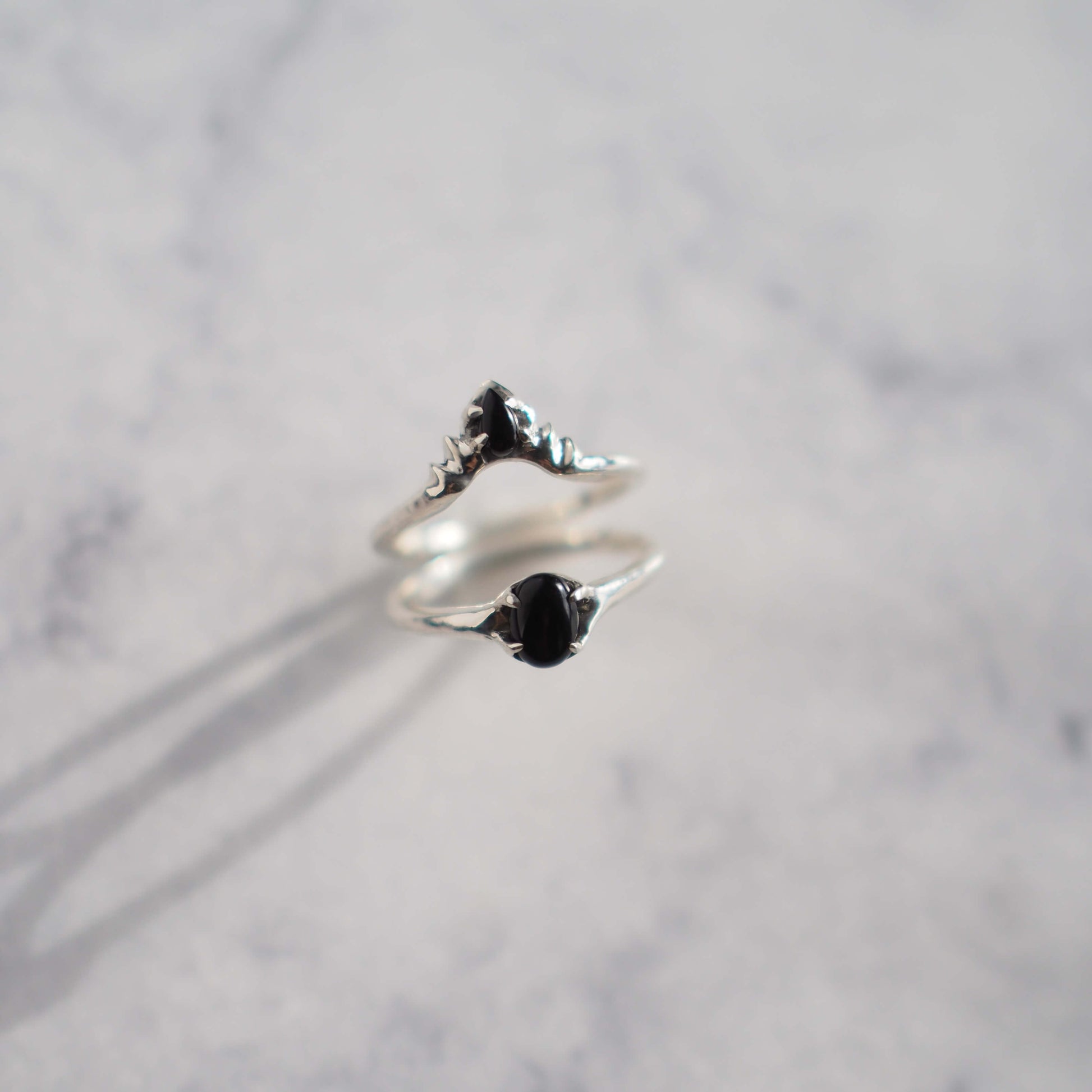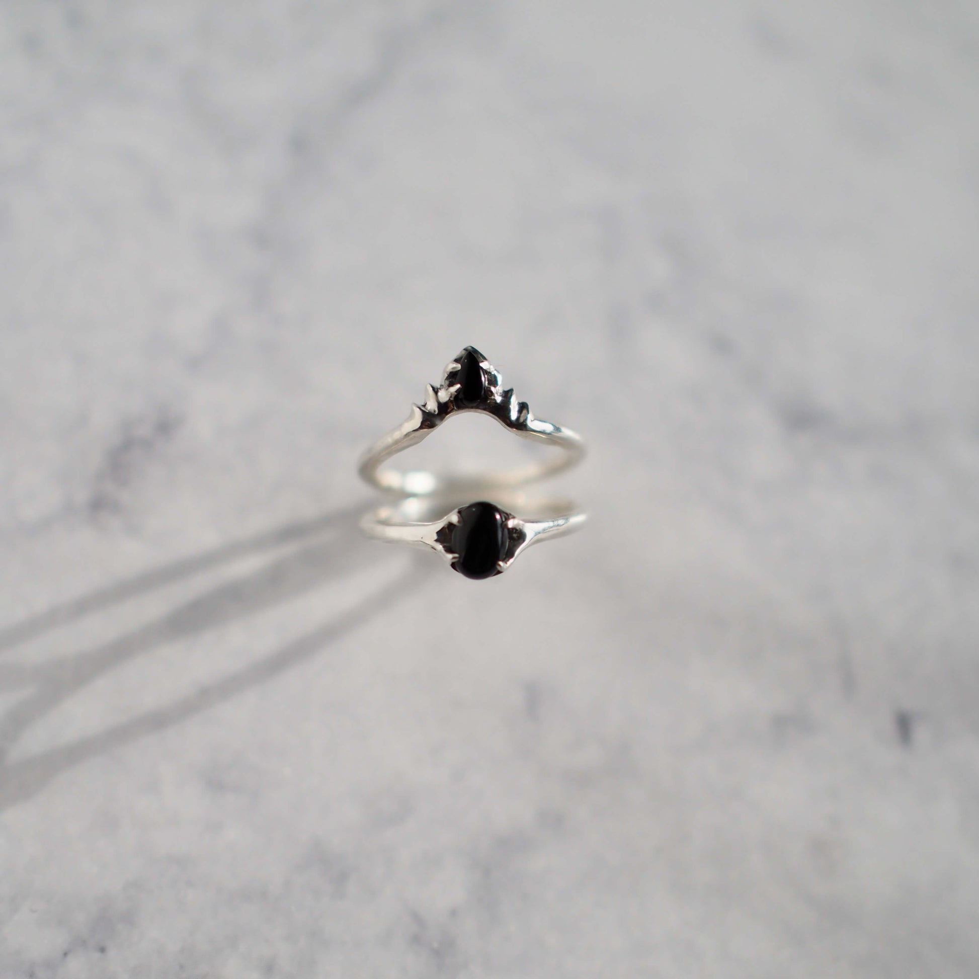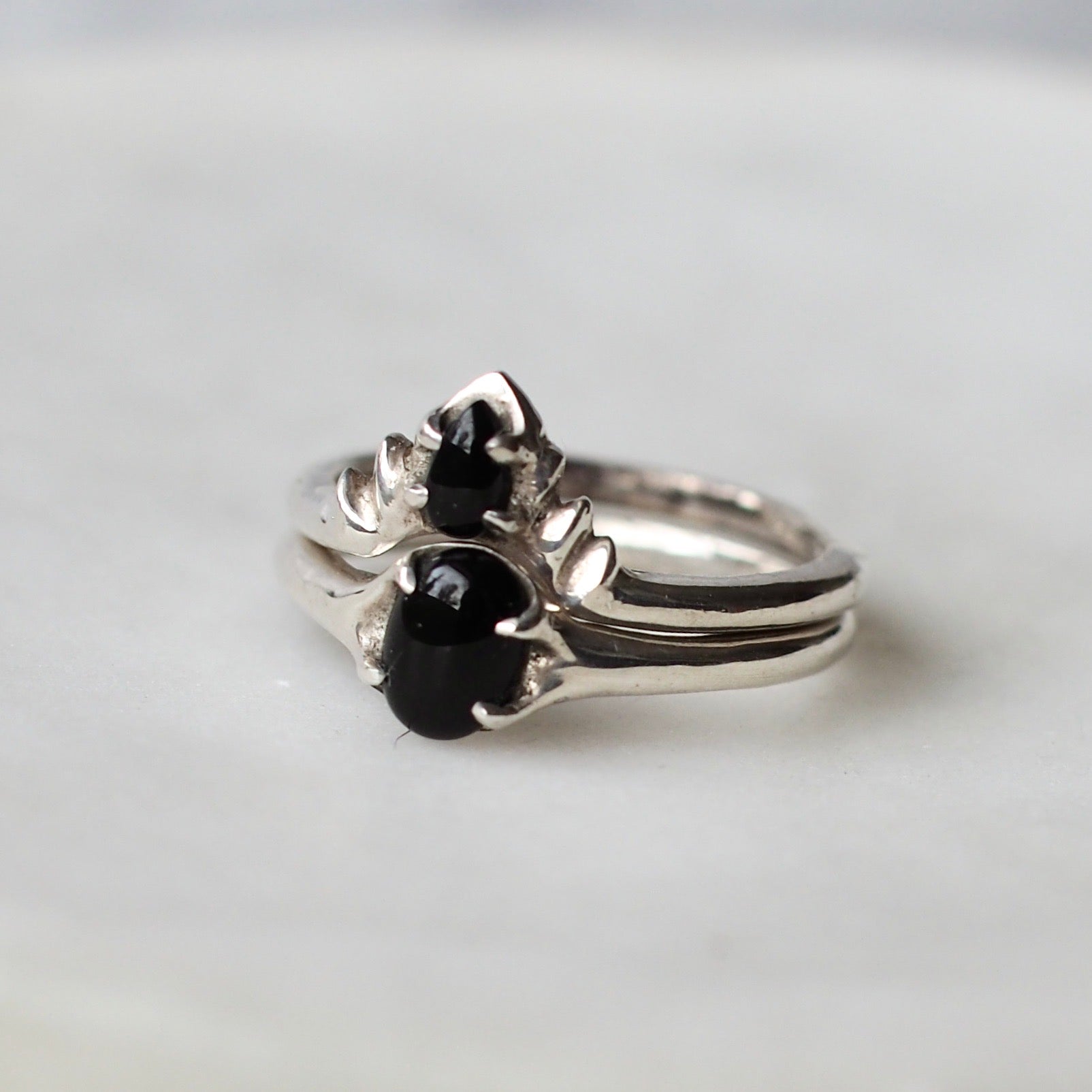This stacking ring set features the tiniest onyx teardrop ensconced in the center of the crown design of this ring. The corona shape is 10mm across, creating a very delicate and dainty piece. The teardrop itself is only 3mm x 5mm!