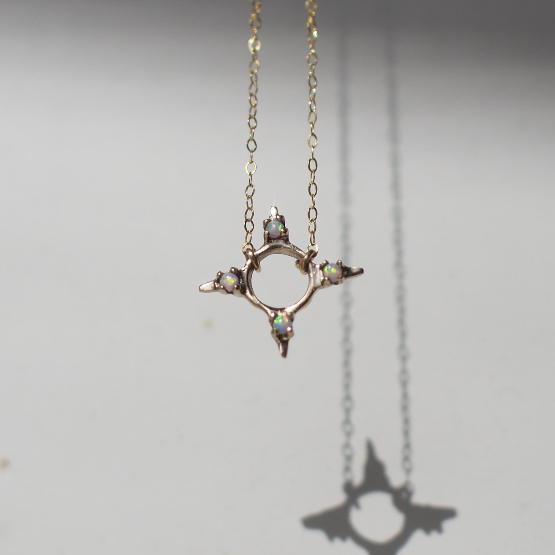 At the heart of this exquisite necklace is a unique circular void of negative space, reminiscent of the eclipse's darkened core. Surrounding this void are four radiant 2mm lab grown opals, mimicking the sliver of sunlight peeking out from behind the moons shadow. This detailed and dainty necklace is less that 3/4 of an inch at the widest diameter of the star.