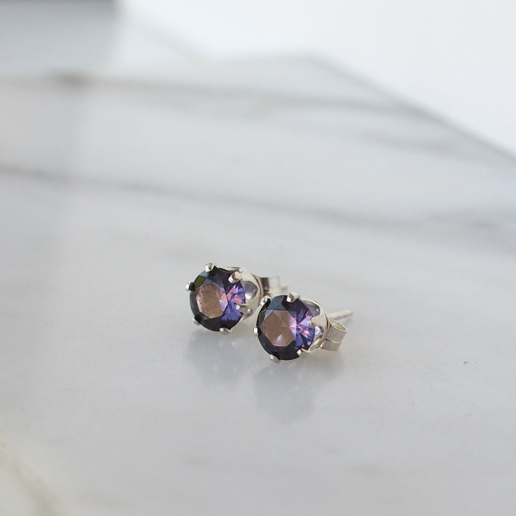 These pretty post earrings showcase a pair of lab grown alexandrite. Each 5mm stone showcases a lovely muted purple color, a little darker than traditional amethyst. The alexandrite is carefully set in a sterling silver prong setting, creating a classic and timeless look that's perfect for any occasion.