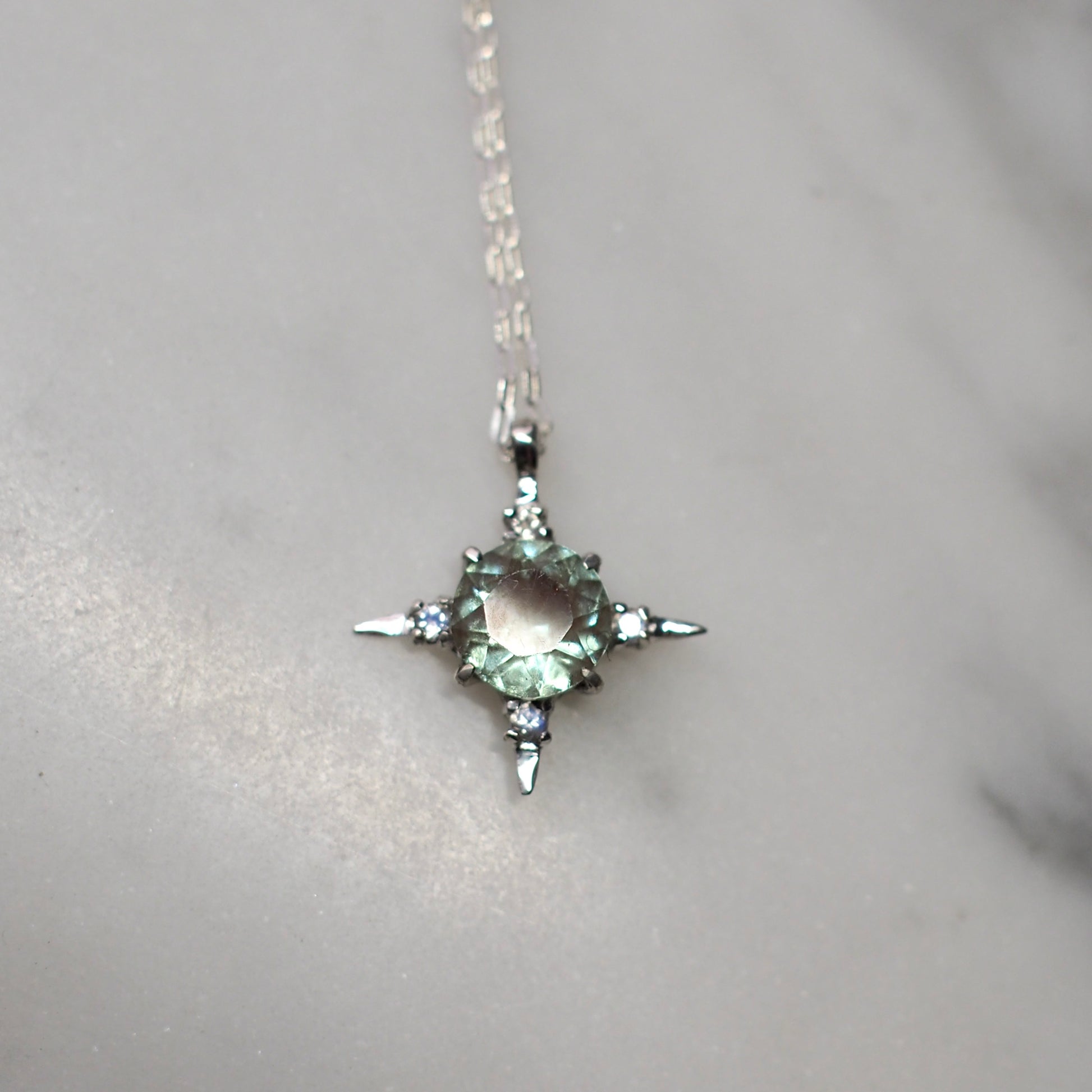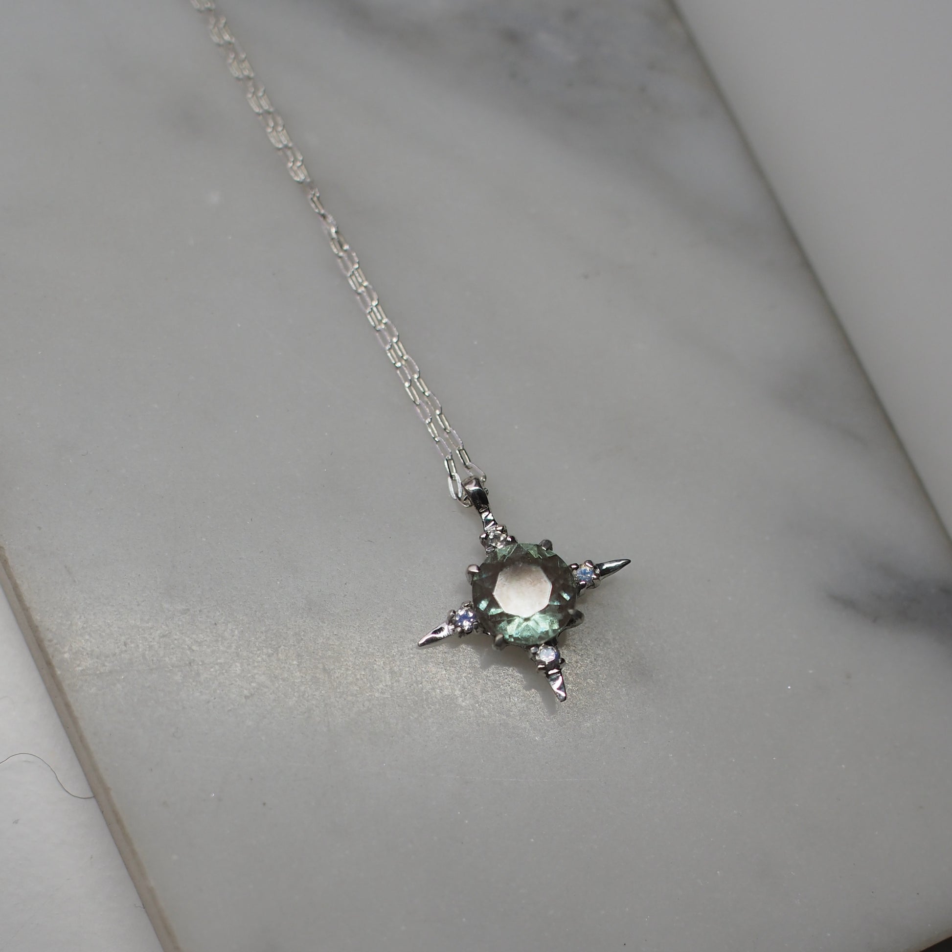 This delicately crafted necklace showcases an enchanting 8mm faceted piece of sapphirine radiating with ethereal beauty, and delicately bordered by four tiny faceted moonstones each containing a subtle blue flash.