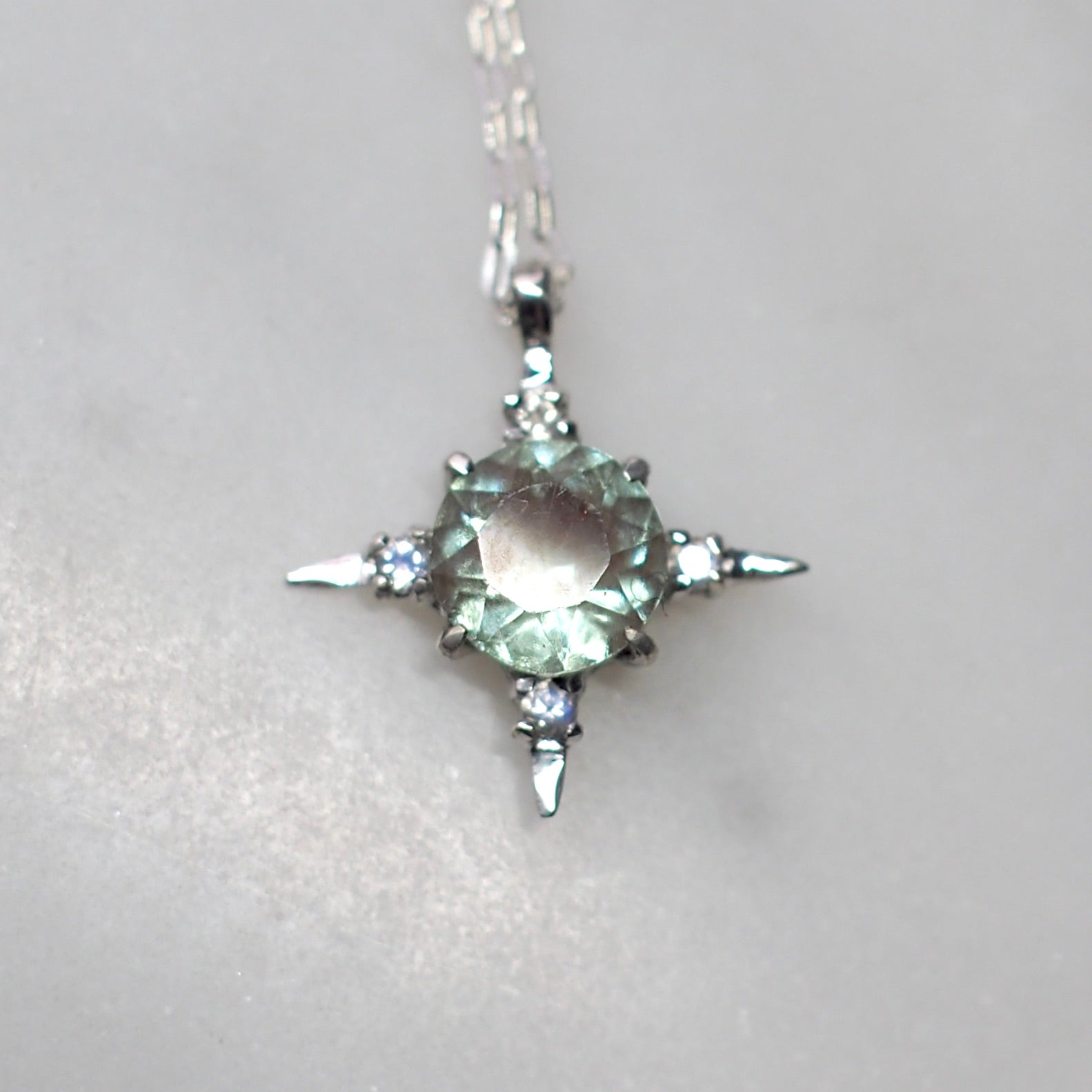 This glass gemstone looks a little like labradorite, a light teal with purple shimmering flash, and is silver foiled on the back. The four 2mm moonstone delicately accentuate its celestial presence, forming a radiant star that embodies elegance.