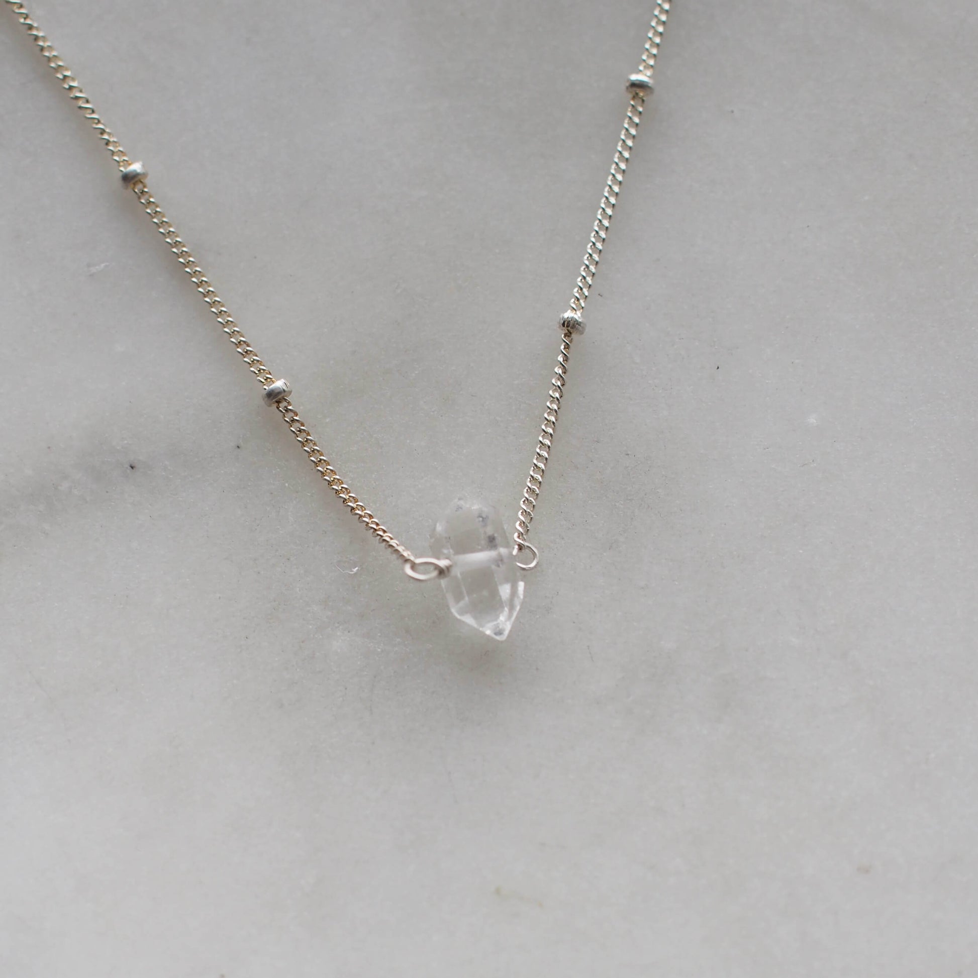 Each raw clear crystal is double terminated (pointed on both sides) and around a centimeter in length and skinny. The crystal you receive will look very similar but not identical to the one pictured. Each crystal is unique! This mini crystal necklace is set on a delicate dotted chain made of sterling silver. Lead and nickel free.