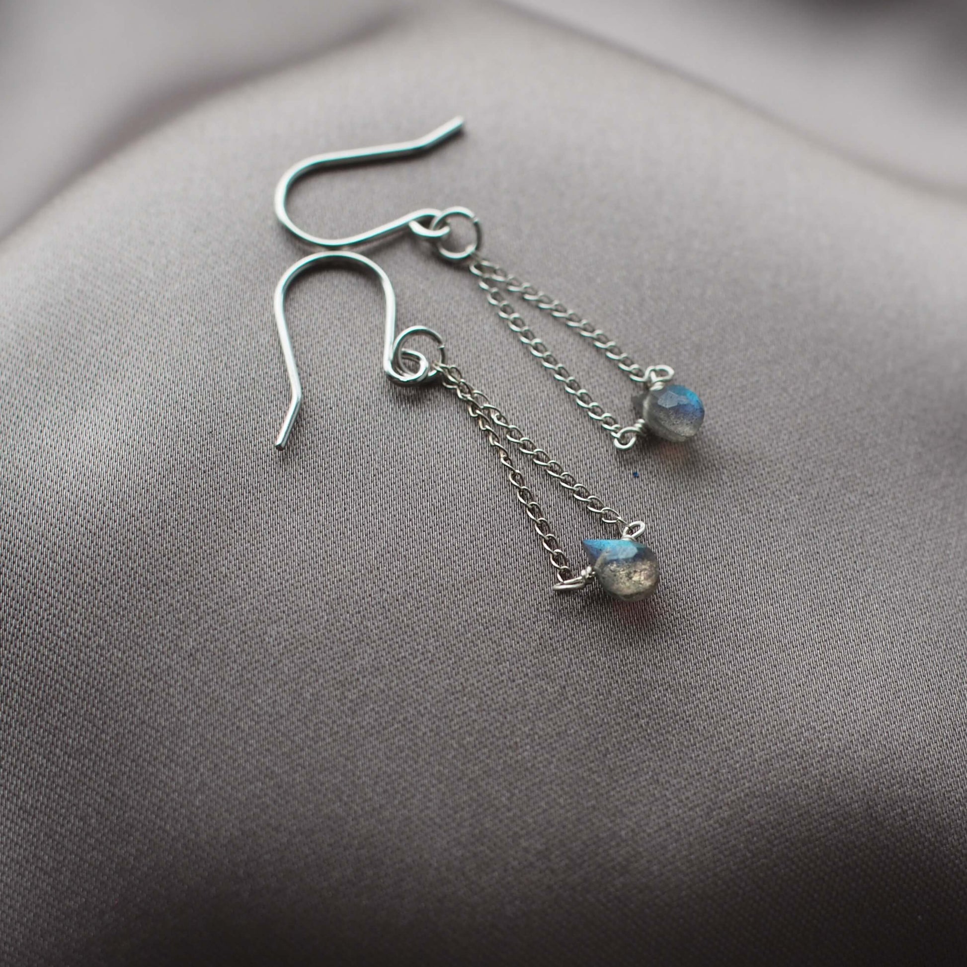 Tiny briolette cut labradorite teardrops cascade down in some the most delicate earrings I've ever made. Each stone has tons of tiny facets in it, layering even more sparkle on top of the already stunning blue green flash of the labradorite. Only the fae could cry tears this pretty.